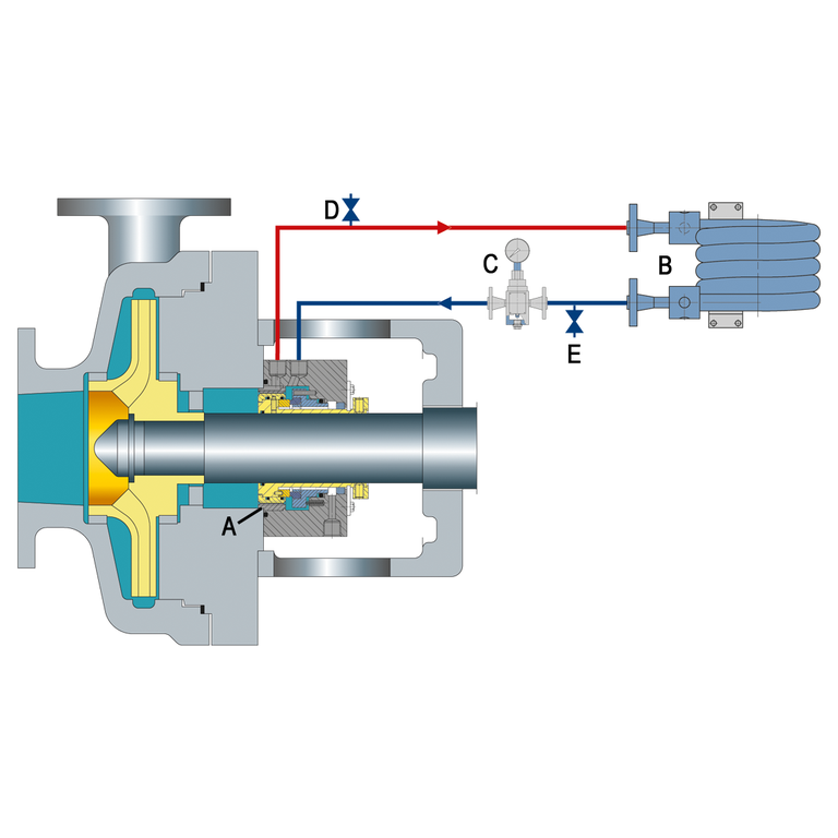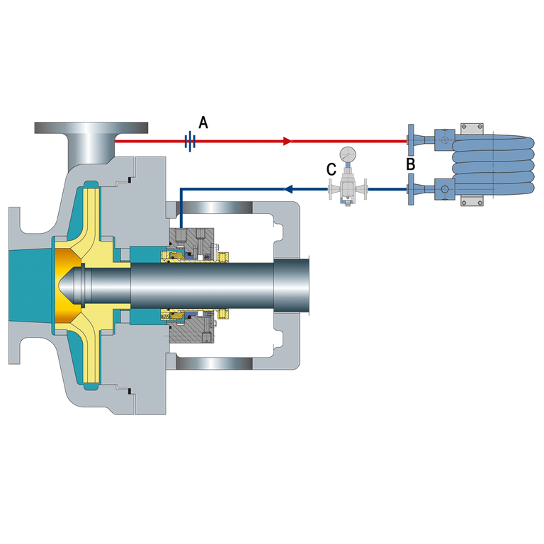 Recirculation from a circulation device in the seal chamber through a cooler and back into the seal chamber.