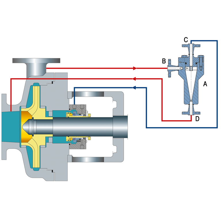 Recirculation from the pump discharge through a cyclone separator delivering the clean fluid to the seal chamber. The solids are delivered to the pump suction line.